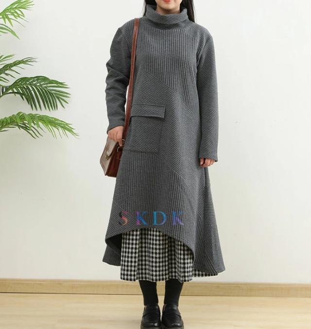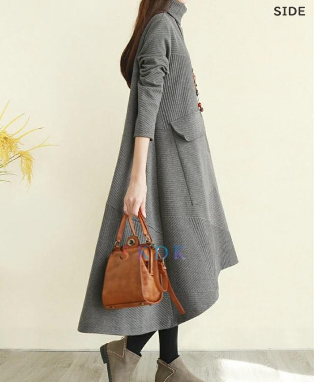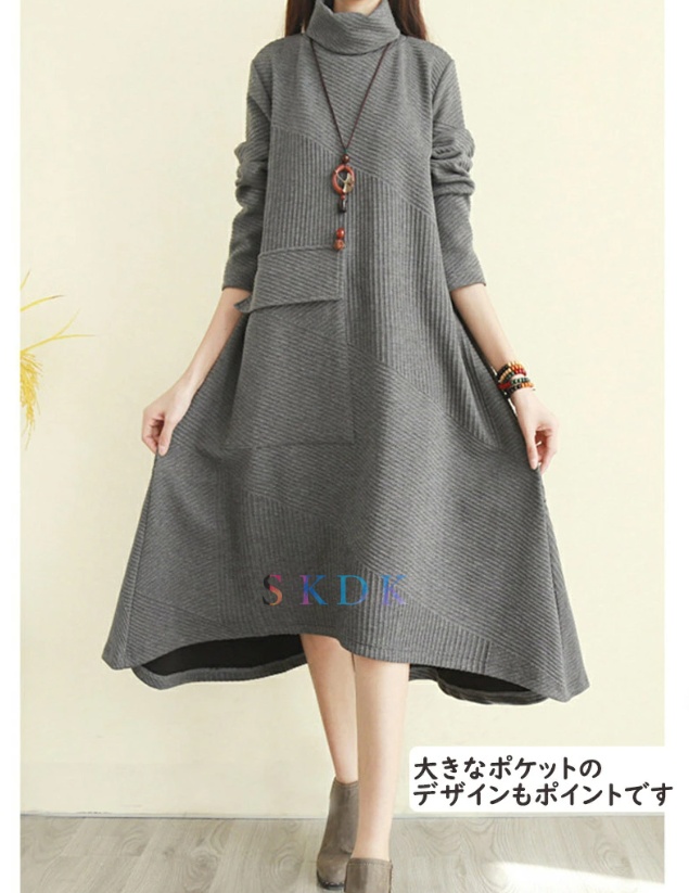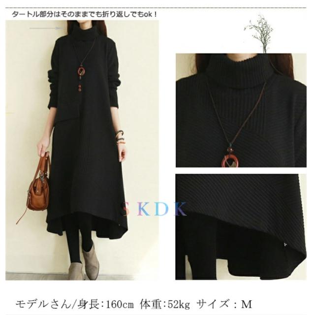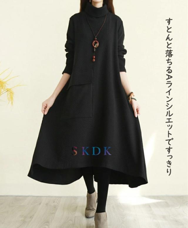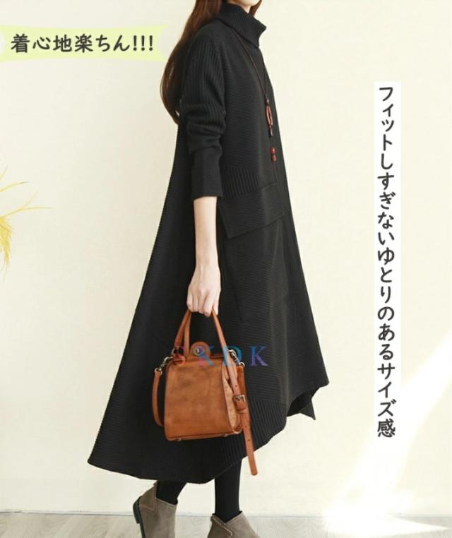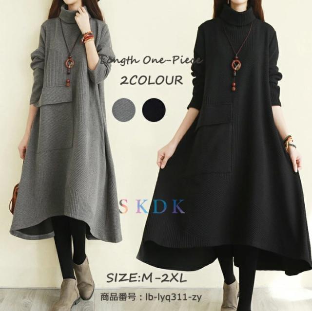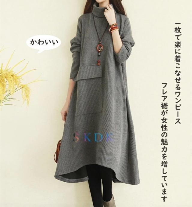 ワンピース レディース 秋冬 ロングワンピース 長袖 チュニック ロングワンピ ミモレ丈 タートルネック 無地 マキシワンピース 大きいサイズ 体型カバー ハイネック フレア Aライン 前後差あり おしゃれ 大人