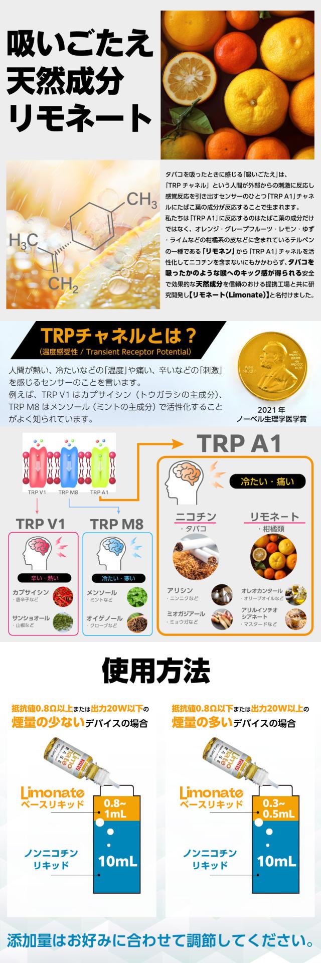 吸いごたえが物足りない・・・そんな電子タバコ(VAPE・ベイプ)ユーザーの声から生まれた、話題の天然成分【リモネート】がついに原液ボトルとして登場!