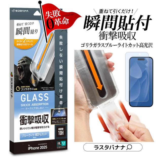 iPhone17 iPhone17 Pro ガラスフィルム 平面保護 ブルーライトカット 高光沢 ゴリラガラス採用 貼付革命 貼り付け革命 瞬間張り 失敗しない レボリューション 衝撃吸収 硬度10H アイフォン 保護フィルム ラスタバナナ