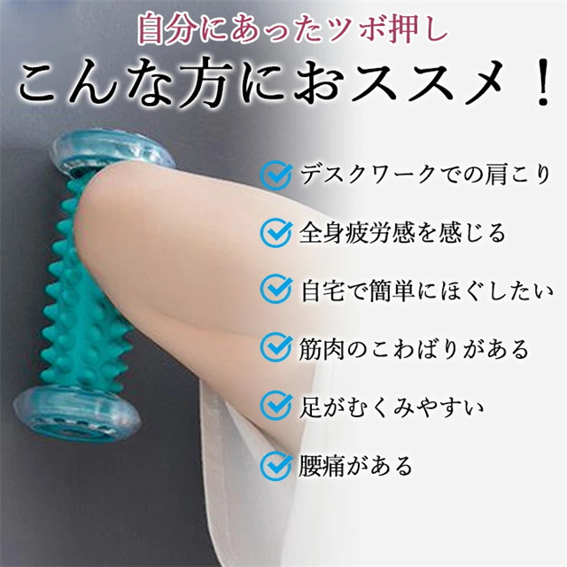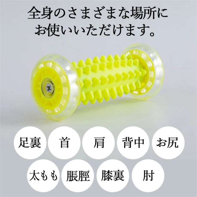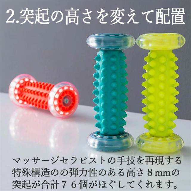 毎日の疲れをスッキリ解消!足つぼローラー! 普段の日常生活の疲労やストレス痛を凝りほぐす ご自宅で簡単!足裏セルフマッサージ 足のマッサージによりもみほぐしてあげることで 血行をよくし、足先むくみや冷えなどを改善する効果もあります。 一日の疲れをほぐし、全身リラックスさせることで 自律神経、ホルモンバランスの乱れを予防し 睡眠の質を向上させる効果につながります。 ご家族やご友人へのプレゼントとしてもおすすめ! 手軽に持ち運びOK!外出先でも使える万能アイテムです。 |