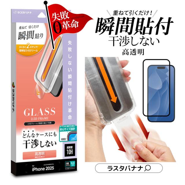 iPhone17 iPhone17 Pro ガラスフィルム 全面保護 高光沢 高透明 クリア 貼付革命 貼り付け革命 瞬間張り 失敗しない レボリューション 干渉しない 絶妙設計 2.5Dフレーム 0.33mm 硬度10H アイフォン 保護フィルム ラスタバナナ