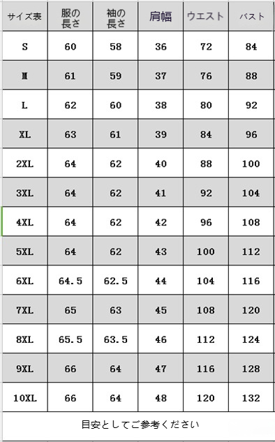 S〜4XL(服の長さ60〜66cm/肩幅36〜48cm/バスト84〜132cm)