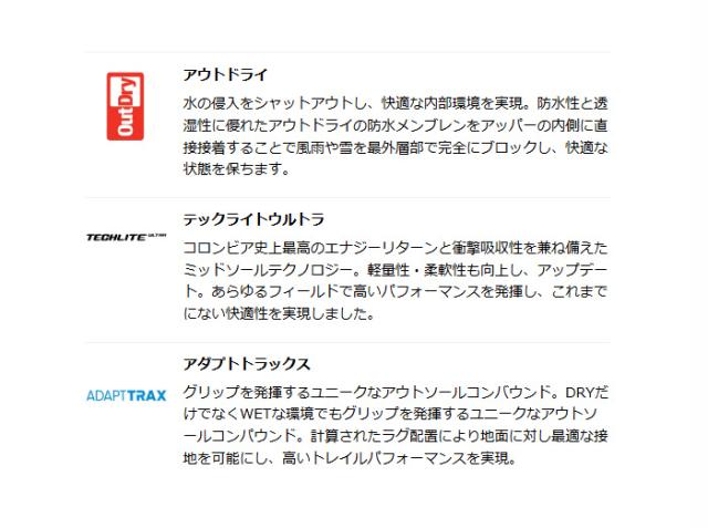 また、防水透湿機能「アウトドライ」が水の侵入を防ぎながらもムレを逃し、シューズ内を快適に保ちます。