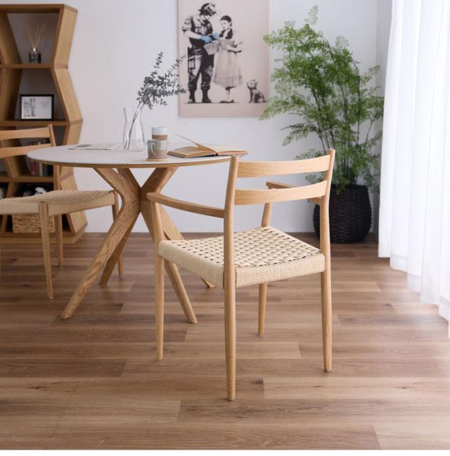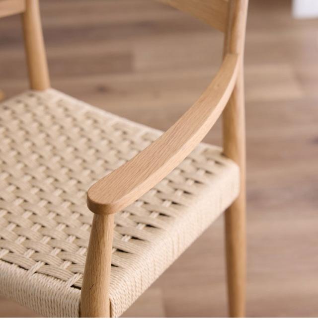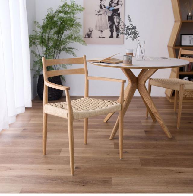 シンプルな肘付きのチェアです。座面にはペーパーコードを使用しているので通気性がよく程よい弾力性で体に馴染みます。インテリアの邪魔をせずどんな場面でもお使いになりやすいチェアです。