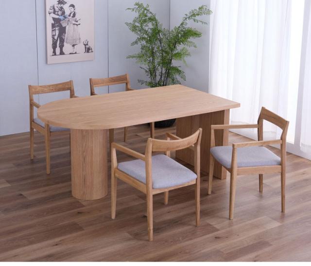 片側は直線に、片側は丸みがかかったデザイナーズテーブルです。片側は直線なので壁にぴったりとつけて使用することができ、空間をすっきりと演出します。角がないことで通路を歩きやすくなったり、脚も内側に入っているので邪魔になりにくい設計となっています。ダイニングチェアはオーク材無垢のシンプルな肘付きチェアです。