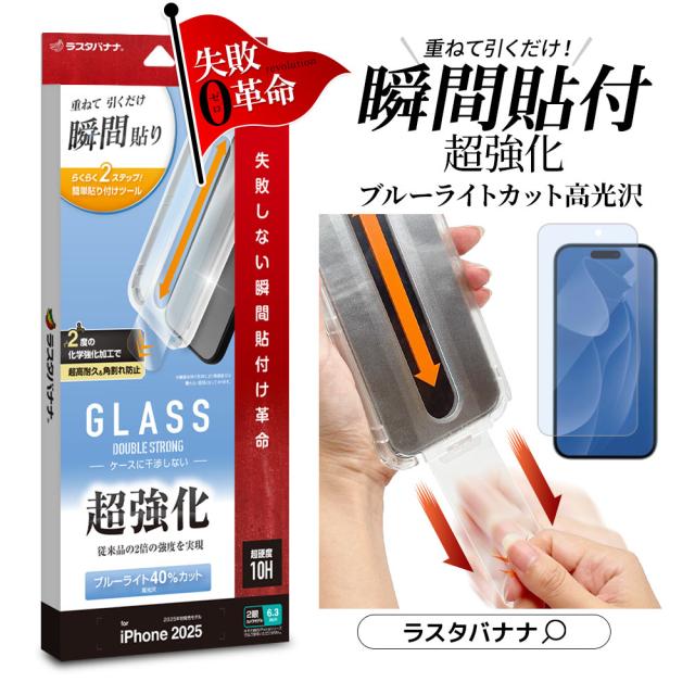 iPhone17 iPhone17 Pro ガラスフィルム 平面保護 ブルーライトカット 高光沢 貼付革命 貼り付け革命 瞬間張り 失敗しない レボリューション 超強化 ダブルストロング 0.33mm 硬度10H アイフォン 保護フィルム ラスタバナナ