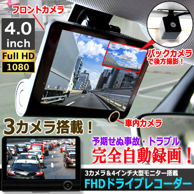フロント&バック&車内3カメラ搭載ドライブレコーダー 4インチ大型モニター 追突 ナンバー 車上荒らし 当て逃げ ループ撮影 あおり運転 事故 駐車