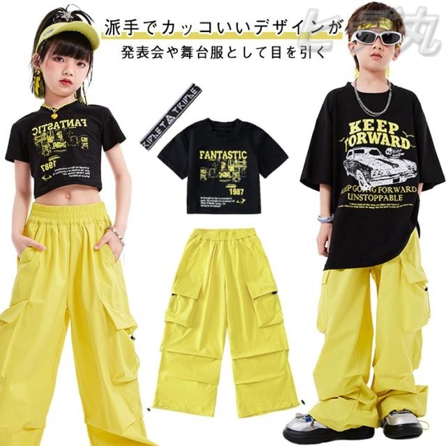 ジャズダンス へそ出し 黄色 ダンス衣装 ダンスパンツ かっこいい カーゴパンツ 黒 ブラック キッズ セットアップ 半袖シャツ ステージ衣装 団体服 ヒップホップ 原宿系 韓国k-pop イエロー HIPHOP 演出服 黄色 応援団 運動会 男の子