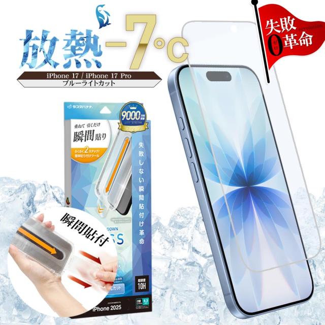 iPhone17 iPhone17 Pro ガラスフィルム 平面保護 ブルーライトカット 高光沢 貼付革命 貼り付け革命 瞬間張り 失敗しない レボリューション 画面の熱を放熱する 放熱ガラス クールダウン 0.33mm 硬度10H アイフォン 保護フィルム ラスタバナナ