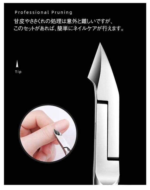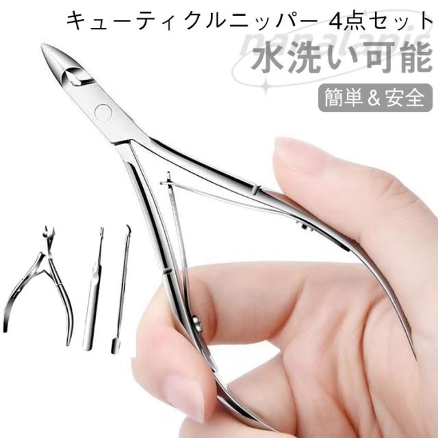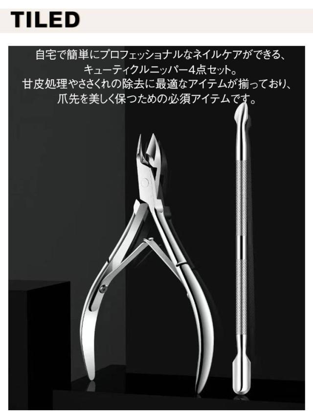 | 【キューティクルニッパー4点セット】【簡単&安全】【水洗い可能】 自宅で簡単にプロフェッショナルなネイルケアができる、キューティクルニッパー4点セット。 甘皮処理やささくれの除去に最適なアイテムが揃っており、爪先を美しく保つための必須アイテムです。 甘皮やささくれの処理は意外と難しいですが、このセットがあれば、簡単にネイルケアが行えます。 高品質なステンレス製の道具は、長く使える耐久性を誇り、手軽にケアを楽しめます。 水洗いできるので、常に清潔に保つことができ、爪へのダメージを最小限に抑えながら、丁寧にケアが可能です。 | |