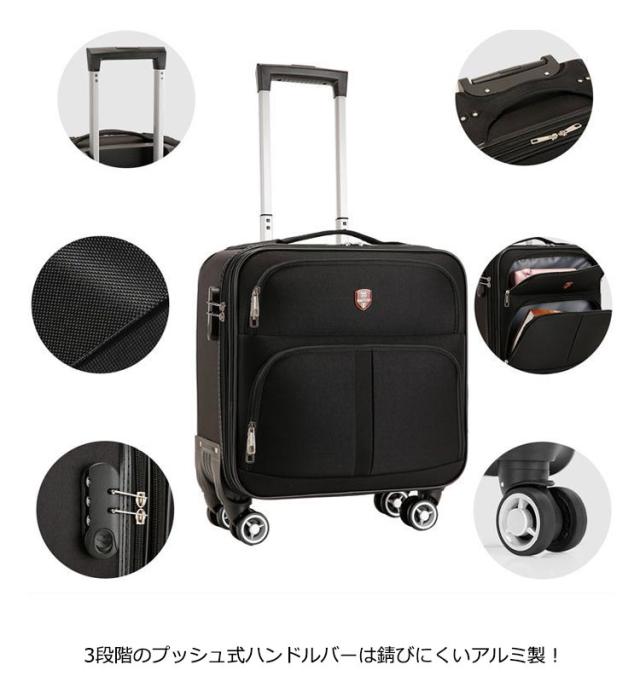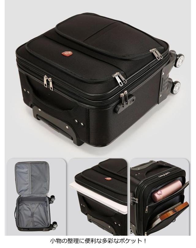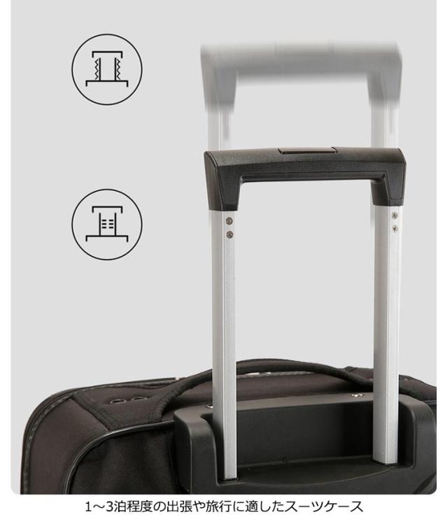 | 出張等で使いやすいビジネスソフトキャリーケース。【機内持ち込み】【撥水加工】【TSA】 1?3泊程度の出張や旅行に適したスーツケース 3段階のプッシュ式ハンドルバーは錆びにくいアルミ製! 360度回転自由自在のダブルキャスターを4輪装備! 小物の整理に便利な多彩なポケット! TSAダイヤルロックシステム標準装備! 100席以上/100席未満の国内線機内持込みに対応。 | |
