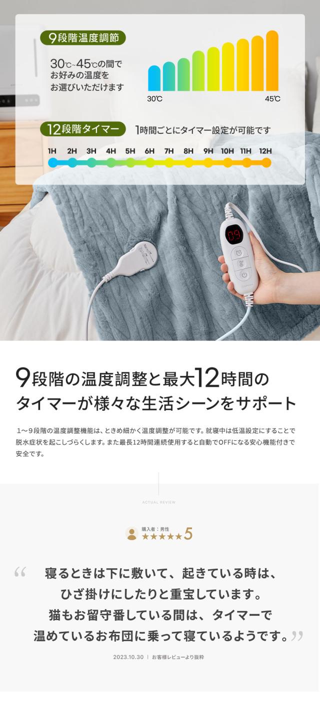 スイッチを入れるだけで体を温められる9段階温度設定(30-45℃)と、1時間単位で細かく調整できる12段階タイマーを搭載。「少しだけ温めたい」シーンにも最適。