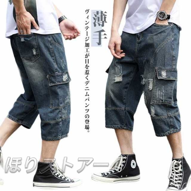 デニムハーフパンツ 夏 デニム メンズ カーゴ 7分丈 春服 デニムパンツ クロップドパンツ 春 カーゴパンツ ジーンズ ゆったり デニム 膝下丈 ダメージ加工 薄手 Gパン カジュアルパンツ 夏服 ズボン 大きいサイズ ストリート カジュアル メンズファッション