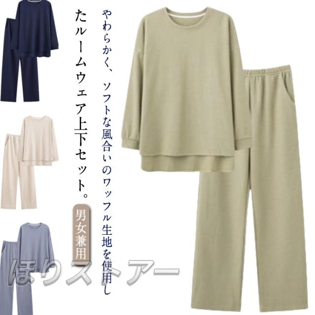 ワッフル 長袖 パジャマ 夫婦 冬 ワッフル 無地 秋 カットソー メンズ ゆったり ペア シンプル 長袖 ナイトウェア ルームウェア セットアップ パンツ プルオーバー 前後差 長ズボン ロングパンツ 上下セット 寝巻き 部屋着