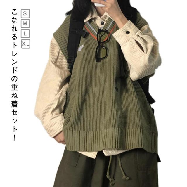 コーデュロイシャツ ニットベスト おしゃれ セーター 長袖 ニット 2点セット トップス ブラウスシャツ 重ね着 春秋 かわいい レディース ベスト 無地シャツ トップス レイヤード 体型カバー セットアップ 着?せ