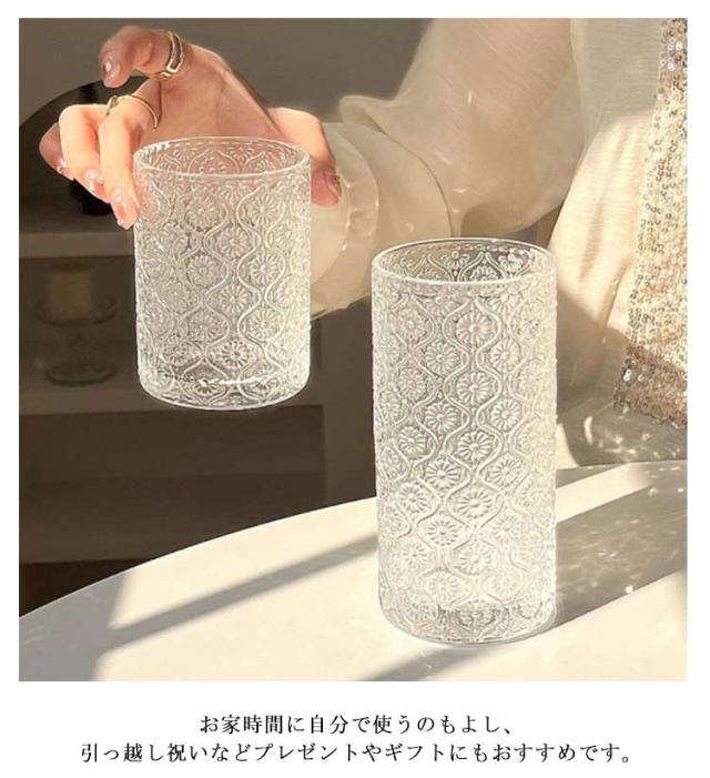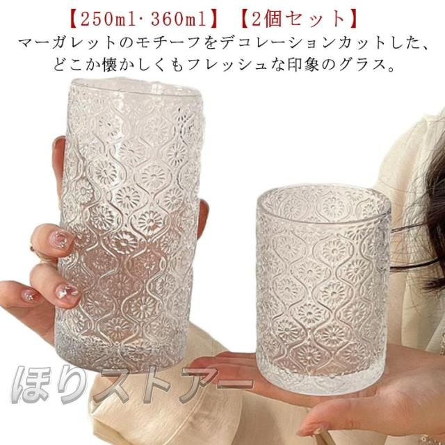 レトロ クリア コップ コーヒー タンブラー ミルク 250ml マーガレット 総柄 ヴィンテージ 大きめ ロックグラス グラス ガラス ガラスカップ ガラスコップ 2個セット 360ml 麦茶 冷茶 透明 ドリング 北欧 おしゃれ ガラス 酒器 ウィスキー