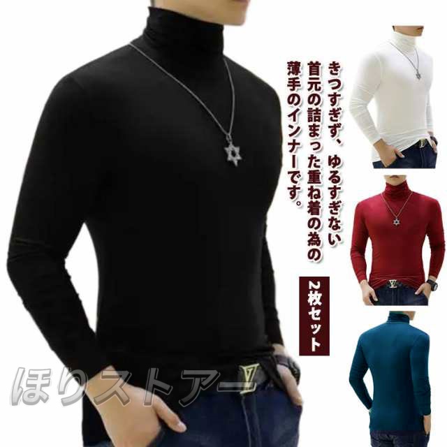 春 2点セット 無地 メンズ カットソー ハイネック tシャツ メンズファッション トップス ロングtシャツ スリム ロンt タイト ストレッチ 長袖 秋 冬 男性 ロングスリーブ 2点セット 秋服 秋物 綿 細身 シンプル 大きいサイズ インナー 黒 白 紺 ネイビー 茶色