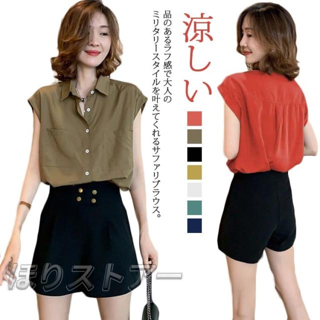 ブラウス オフィスカジュアル 胸ポケット レディース フレンチスリーブ 袖なし 襟付き シャツノースリープ ミリタリー シャツブラウス ボーイッシュ 送料無料 サファリシャツ 春 夏 半袖 シャツ ロールアップスリーブ トップス