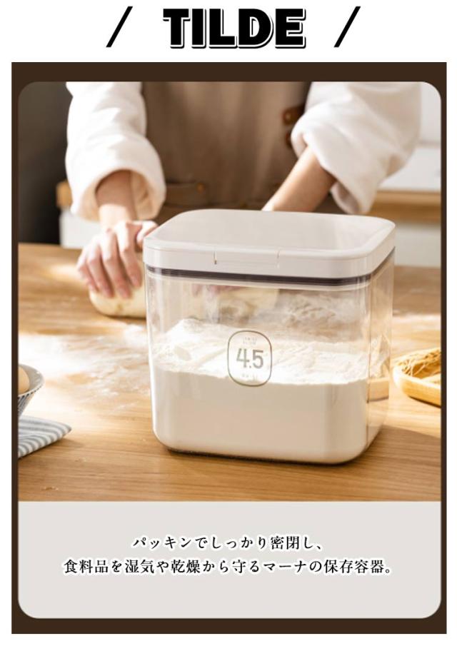 | パッキンでしっかり閉まって湿気を防ぎ、ワンタッチで開く保存容器です。【2個セット】【4.5L】 パッキンでしっかり密閉し、食料品を湿気や乾燥から守るマーナの保存容器。 いつでも開けたてのおいしさをキープできるようデザインされたフタは、ワンタッチでオープンする簡単な操作性で使いやすく、調理のときも快適な使い心地になっています。 "ワイドトール" の容量は2.0L。小麦粉1kgが袋ごとぴったり入るサイズです。 密閉性と操作性を兼ね備えた、人と暮らしに寄り添う保存容器シリーズです。 口が広いため袋ごと容器に保存した食料品も中身が取り出しやすくなっています。 本体・フタ・パッキンと細かく分解して洗浄できます。容器の入口が広いので洗いやすく、隅々まできれいにできて衛生的です。 | |