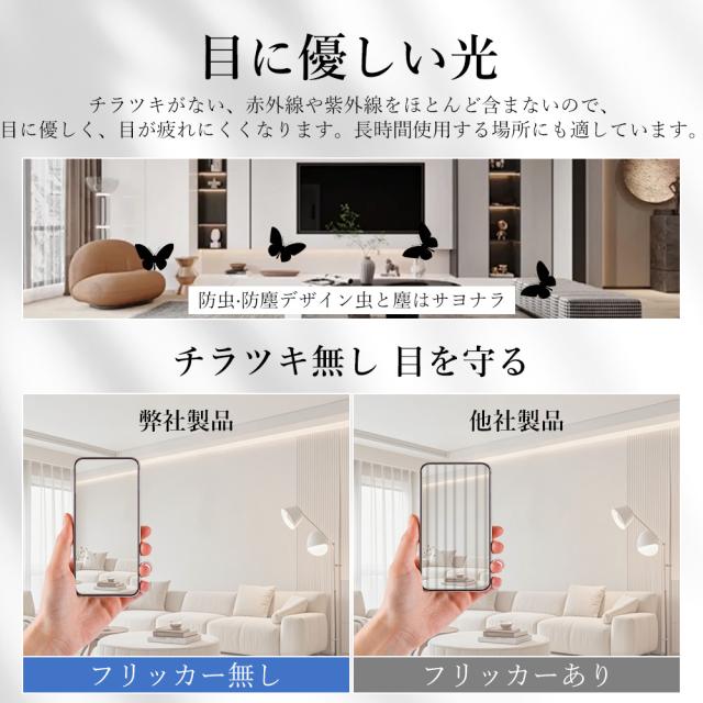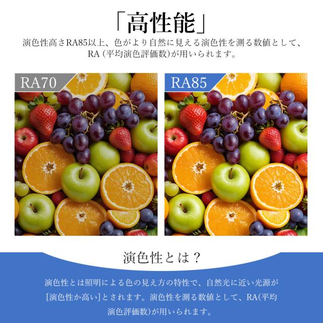 - 演色性の高いRa85のLEDを採用しており、自然光に近い美しい光で物の色をより鮮やかに再現します。料理やインテリア、小物なども本来の色味で見えるため、目にもやさしく、日常の快適さがぐんとアップ。空間の雰囲気を大切にしたい方にもぴったりです。