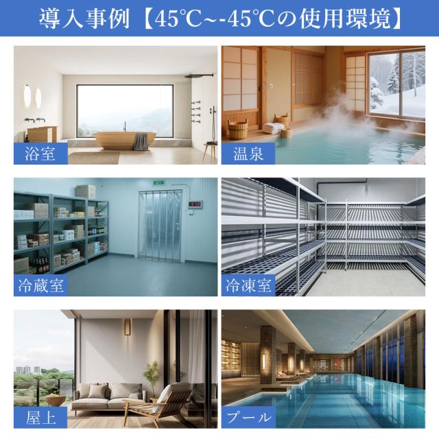 - ★入浴場・温泉施設・冷蔵室・冷凍室・ベランダ・屋内プール・老人ホーム・家庭・病院・学校・公共場所・展示場・加工工場・食品工場・倉庫・営業所・工場など幅広くご満足いただけます。 ★使用温度範囲は、-40℃〜45℃と幅もありますので、様々なシーンで併用することも可能です。
