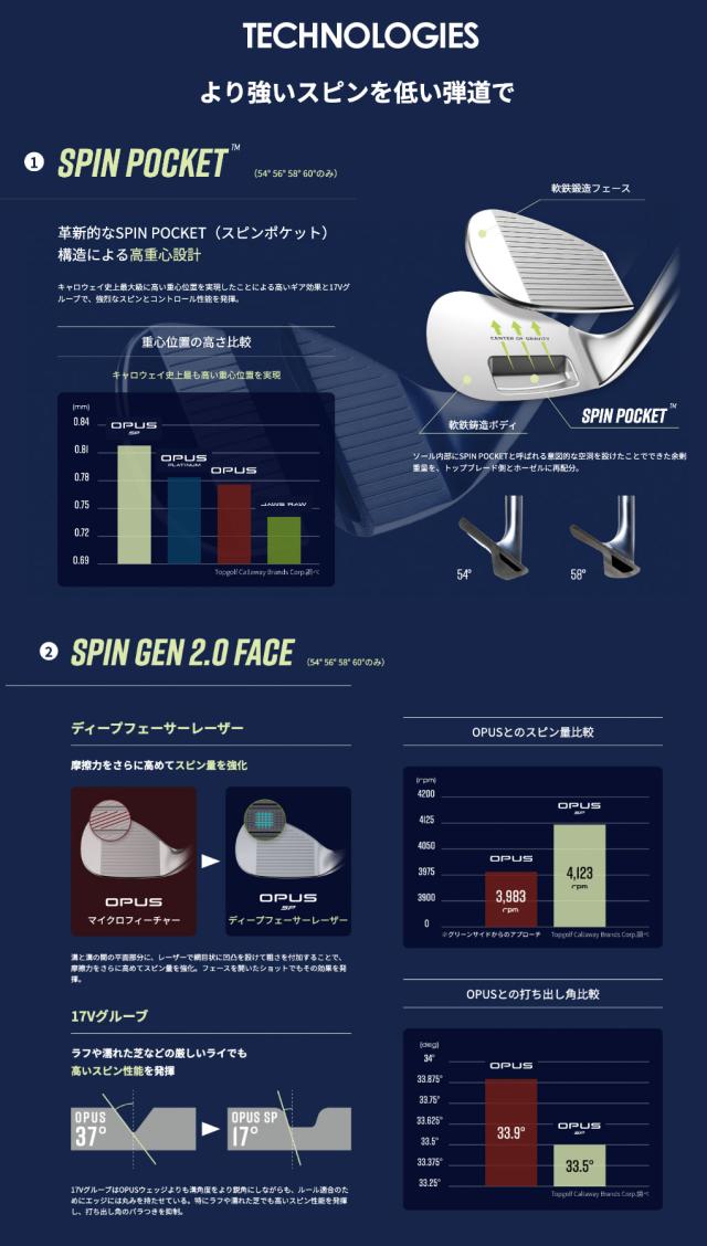 OPUSウェッジの登場からわずか1年足らずで、さらに進化を遂げたウェッジがラインアップに加わります。開発者が追求し続けてきた重要指標 Spin Per degree(スピン/打ち出し角)の2つの頭文字を名前に取り入れた、「OPUS SPウェッジ」です。フェースには新開発の17Vグルーブを狭いピッチで配置し、ソール内部にはキャロウェイ独自の革新的な内部構造であるSPIN POCKET(スピンポケット)を搭載。このSPIN POCKETによって重心設計が最適化され、強烈なスピンと狙い通りの低弾道を実現します。さらに、従来のマイクロフィーチャーに代わって、網目状の粗さを生み出すディープフェーサーレーザーを初採用。スピン性能と止まる力を、これまで以上に高めました。ツアープロにも高評価を得たShape 6(シェイプ6)のヘッド形状を継承し、 仕上げはクロムとブラックの2タイプ。ソールグラインドは、T、C、X、S、Wの5種類をラインアップ。すべてのプレーヤーに対応できる完成度を誇ります。【SPIN GEN 2.0フェース—あらゆるライで最大スピンと安定した打ち出しを実現】