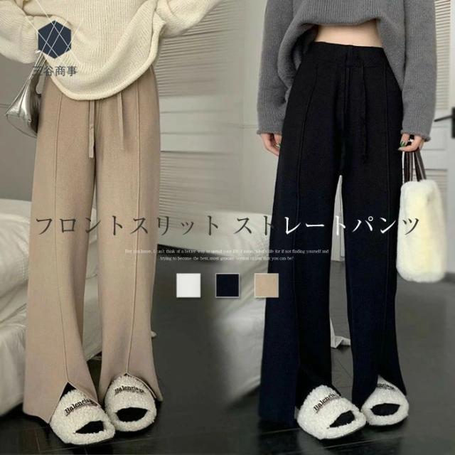 ニットパンツ ワイドパンツ レディース 春 秋 冬 フロントスリット ガウチョパンツ ウエストゴム ニット ゆるパンツ ストレートパンツ リラックス ゆったり 楽ちん ロングパンツ フレアパンツ 美脚 細見え 通勤 入学式 入園式 卒業式