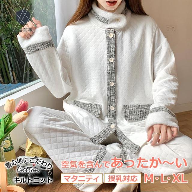 パジャマ 大きいサイズ ルームウエア パジャマ 安い 授乳服 パジャマ おしゃれ 冬 入院パジャマ ニットキルト部屋着セットアップ あったか 前開き長袖 産前産後 防寒 ナイトウエア 暖かい 新年祝い 入院 産後 無地ベージュ