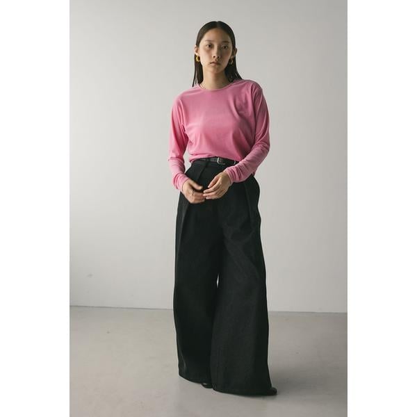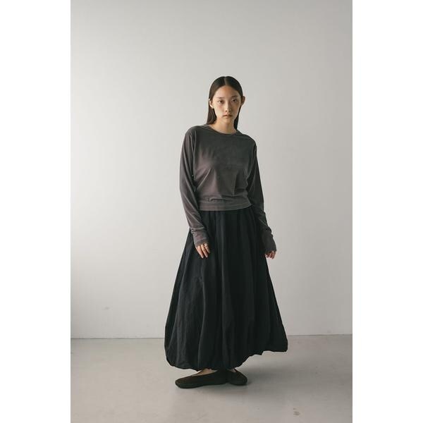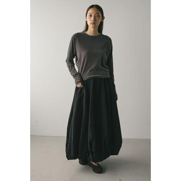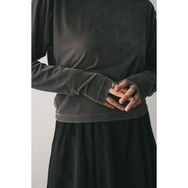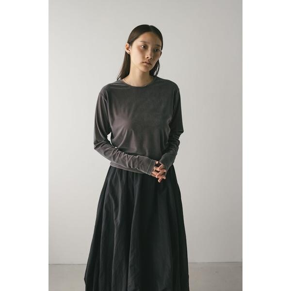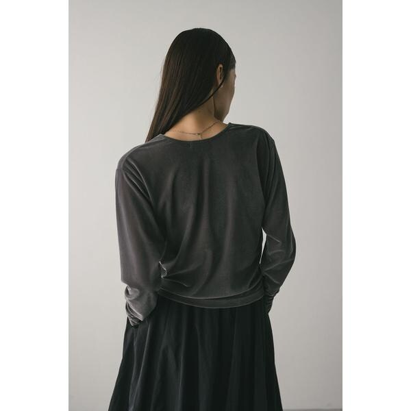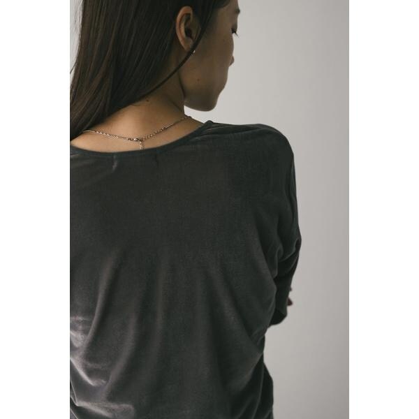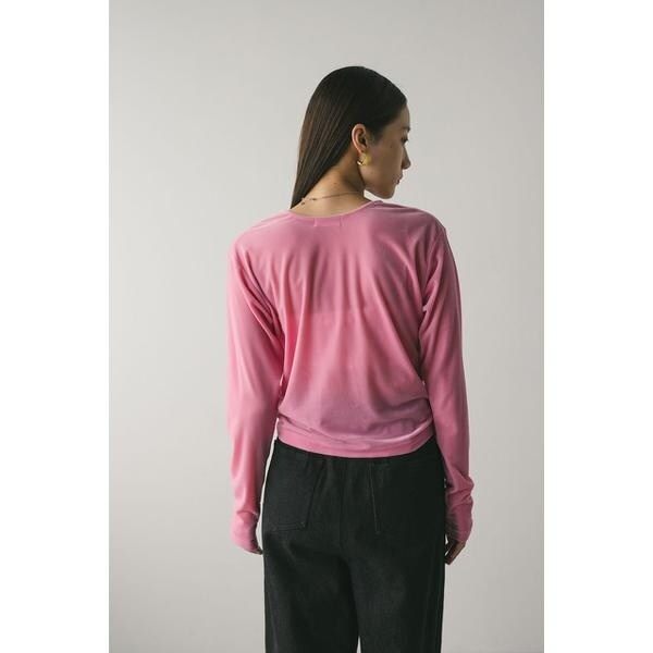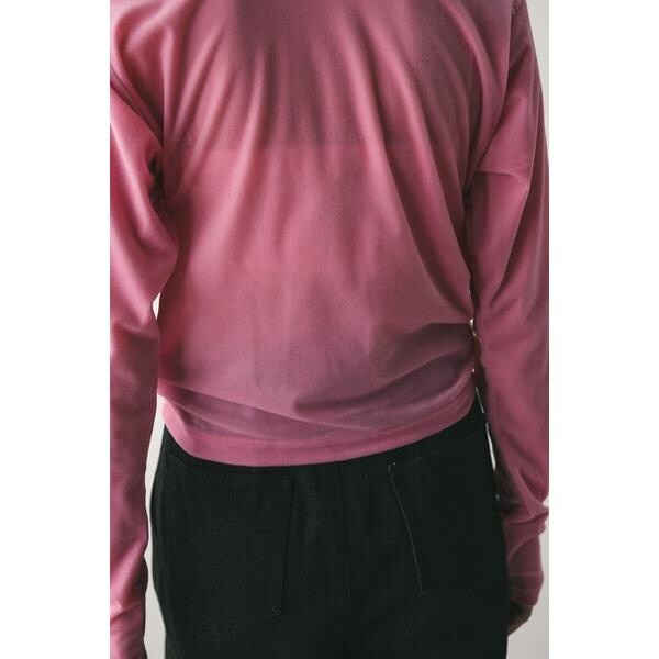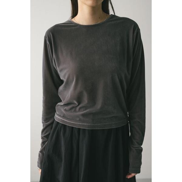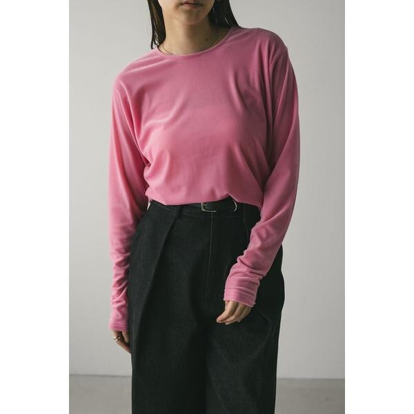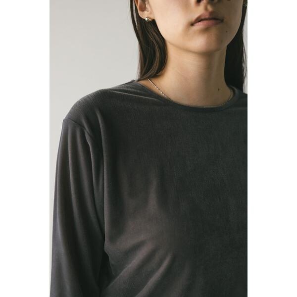 モデル身長165cm(FREEサイズ着用)しなやかで肌なじみの良いメッシュベロア素材を使用したロンT。ゆったりとした身幅とドロップショルダーで抜け感のあるシルエットにこだわった一枚です。透け感ややあり、ストレッチあり。【お手入れ方法】マシンウォッシュ可