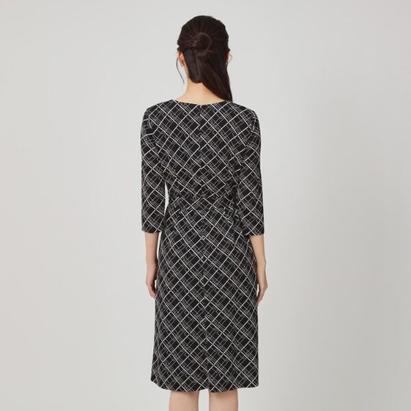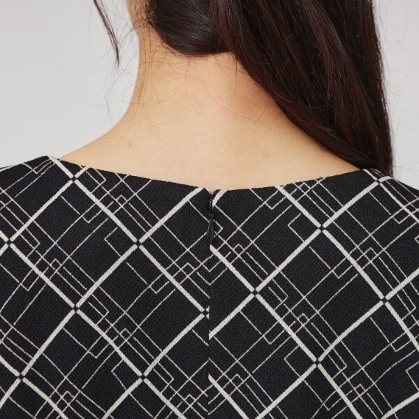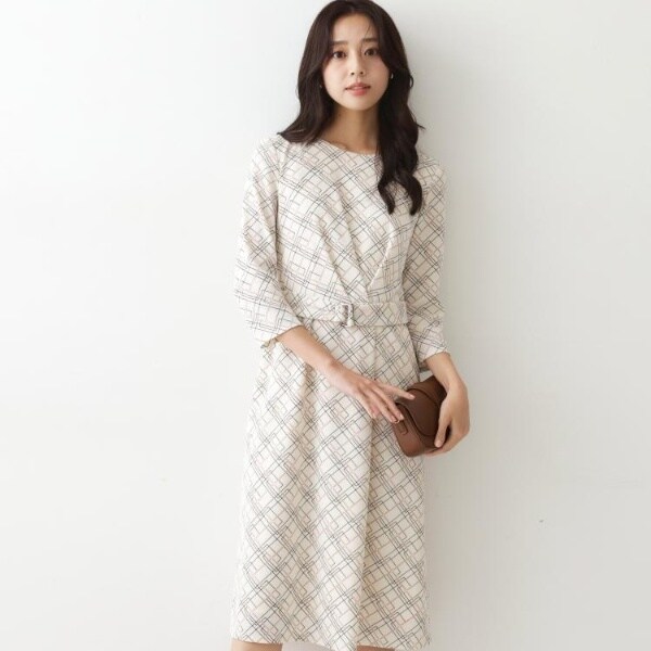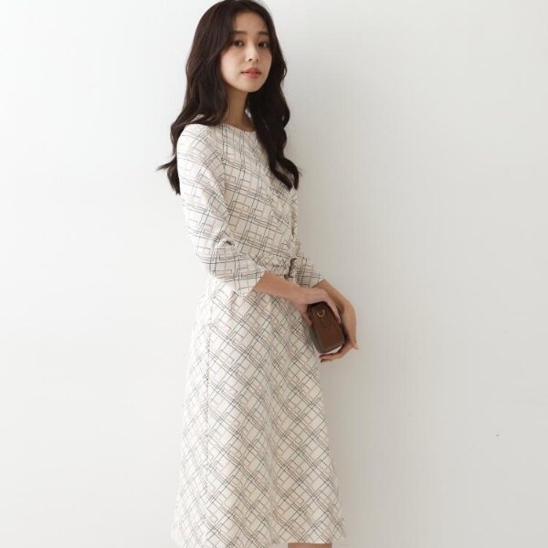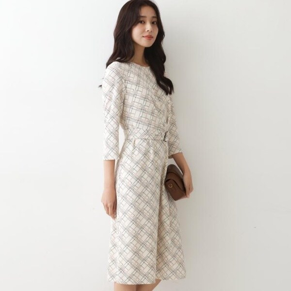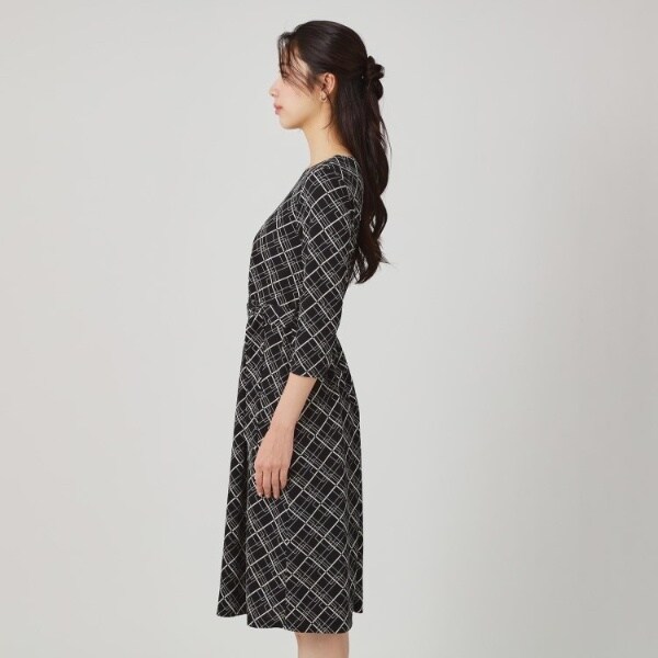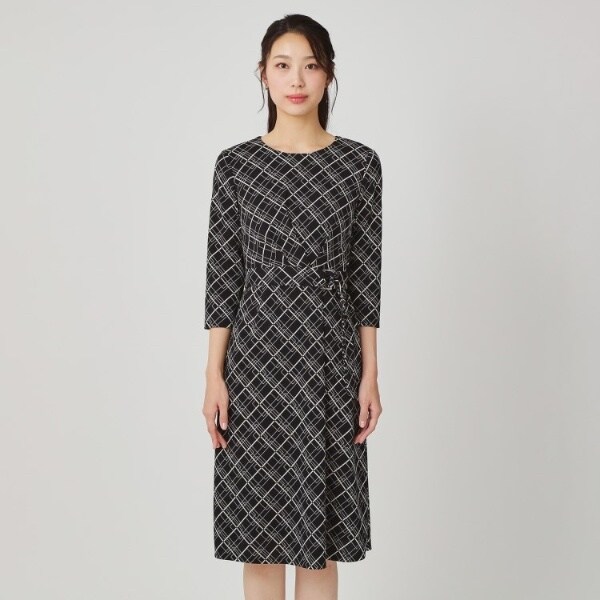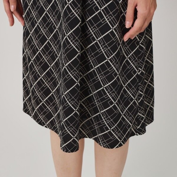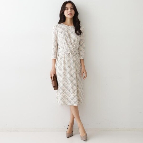 裾にかけてセミフレアーラインにし、スカート部分のタックデザインがレディな印象に。