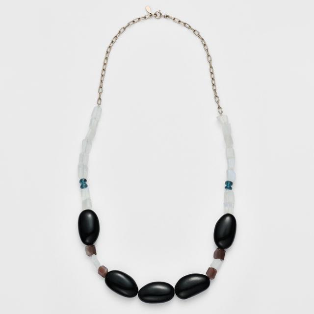 ビーンズのような、ゆるやかで温もりのあるフォルムのジェットを主役にした、ボリューム感のあるネックレス。丸みのあるジェットに、あえてシャープなラフカットのホワイトラブラドライトと、柔らかな光を宿すムーンストーンを合わせることで、デザインに奥行きとリズムが生まれます。さらに、差し色としてトパーズを添えることで、全体にひとさじの気品と透明感をプラス。オーバルフォルムで揃えた石たちが調和しながら、ブルーグリーンを基調としたアガットらしい配色に仕上がっています。※天然石や天然素材を使用しているものは、サイズ・色味・風合いの違いや、若干の傷、内包物の有無などに個体差があります。予めご了承ください。
