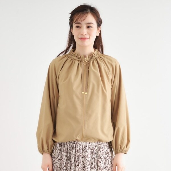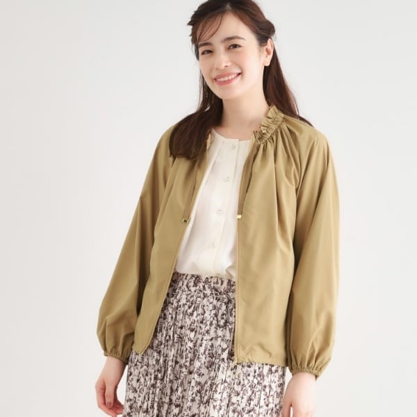 首元はギャザー仕様にすることでフェミニンな雰囲気をプラス。顔周りも華やぎます。
