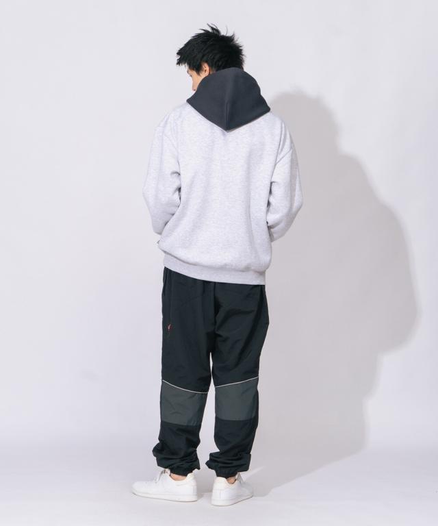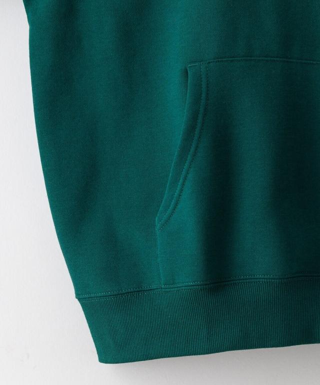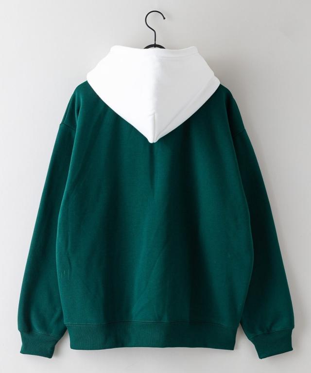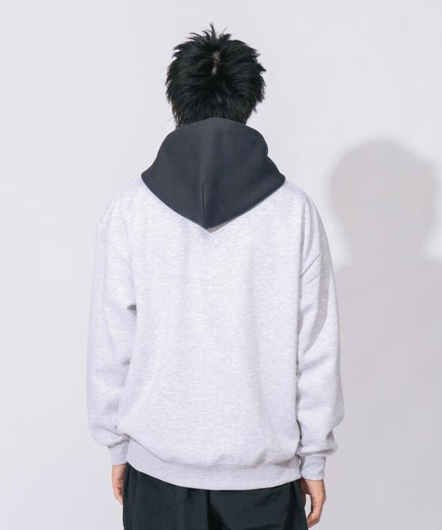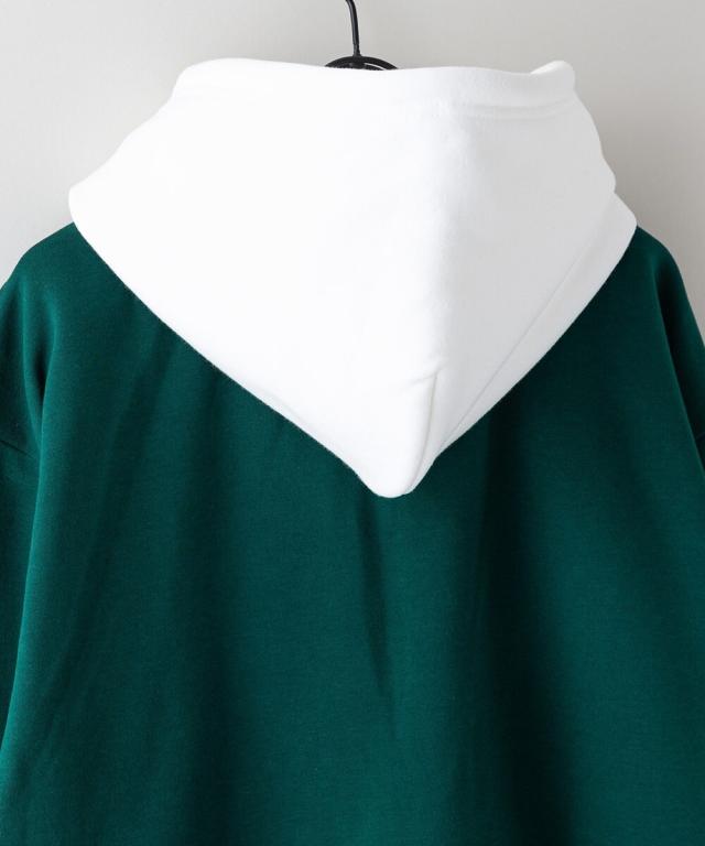 ボリュームのある380gのヘビーウェイト裏起毛スウェットをBODYに使用。胸にはシンプルなロゴ刺繍。配色フードにすることで、個性ある1着に仕上がりました。ユニセックスでおススメです。
