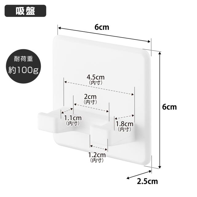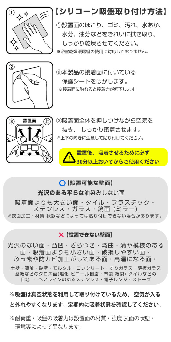 | 備考 | 使用できる面:光沢のある平らな油染みしない面で吸着面よりも大きい面(タイル・プラスチック・ステンレス・ガラス・鏡面(ミラー)) ※表面加工・材質・状態などによっては貼り付けできない場合があります。 |