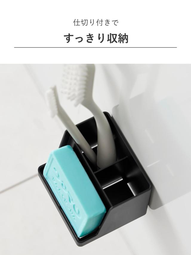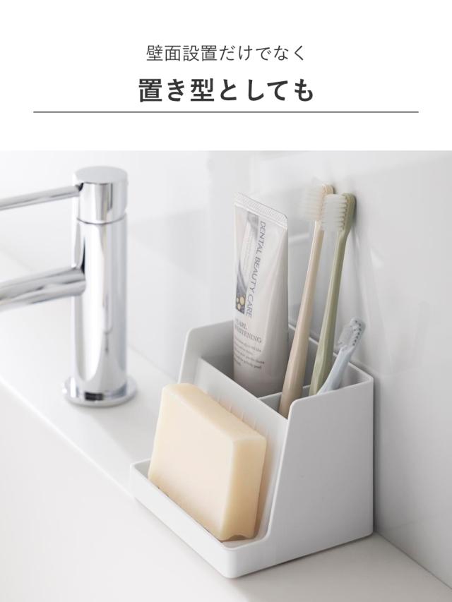 収納スペースと仕切り付きで、石けんと洗面小物をひとまとめに収納できます。洗面用品だけでなく、洗濯用石けんと洗濯ブラシセットの収納にもおすすめです。