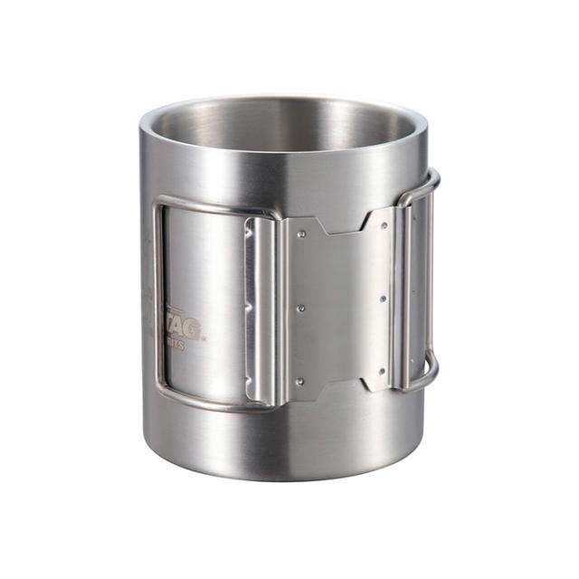 | 中空二重構造で冷めにくいステンレス製マグカップ。 ハンドルは折りたたみ可能。 |