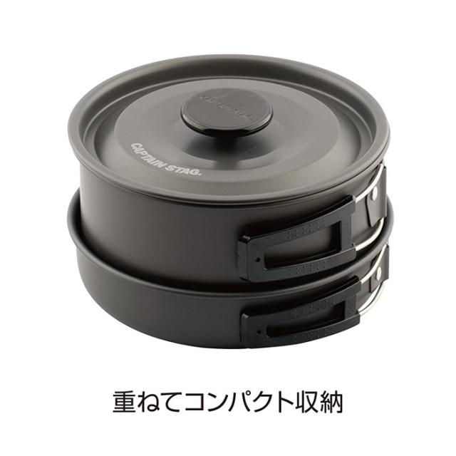 熱伝導率の高い軽量アルミ合金製、表面には耐食性の高い硬質アルマイト加工済みのクッカーとオーソドックスな形状のアウトドア用ケトル1.1L付き