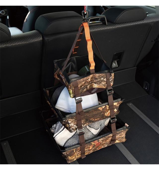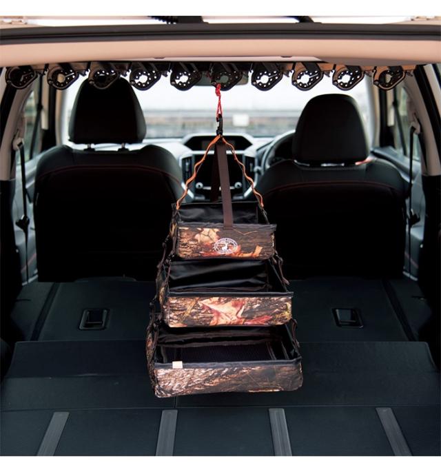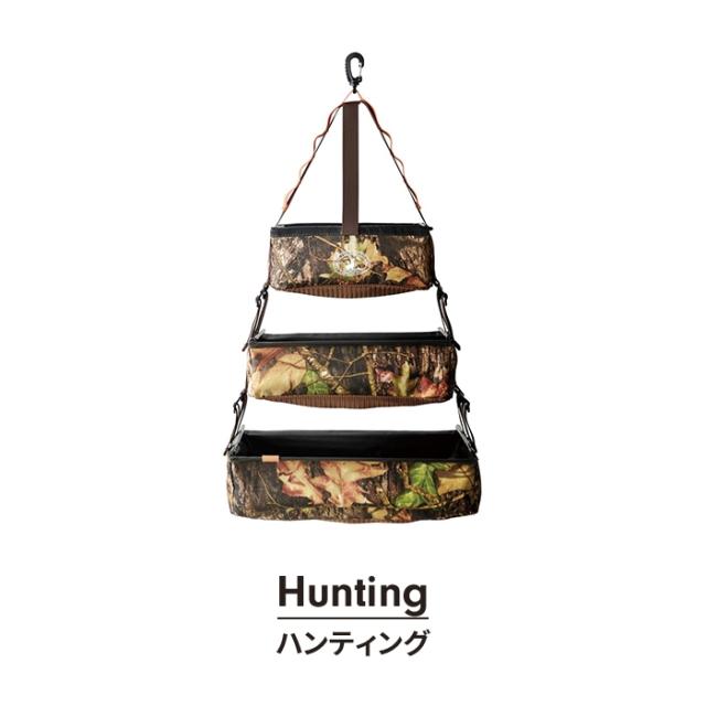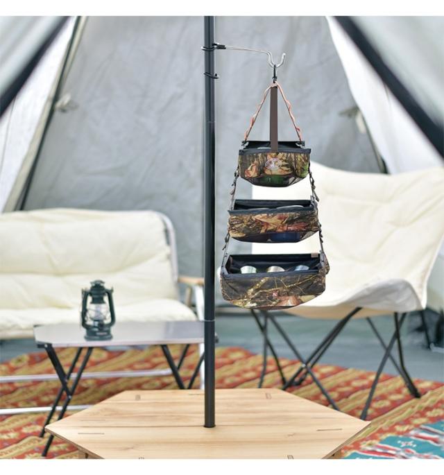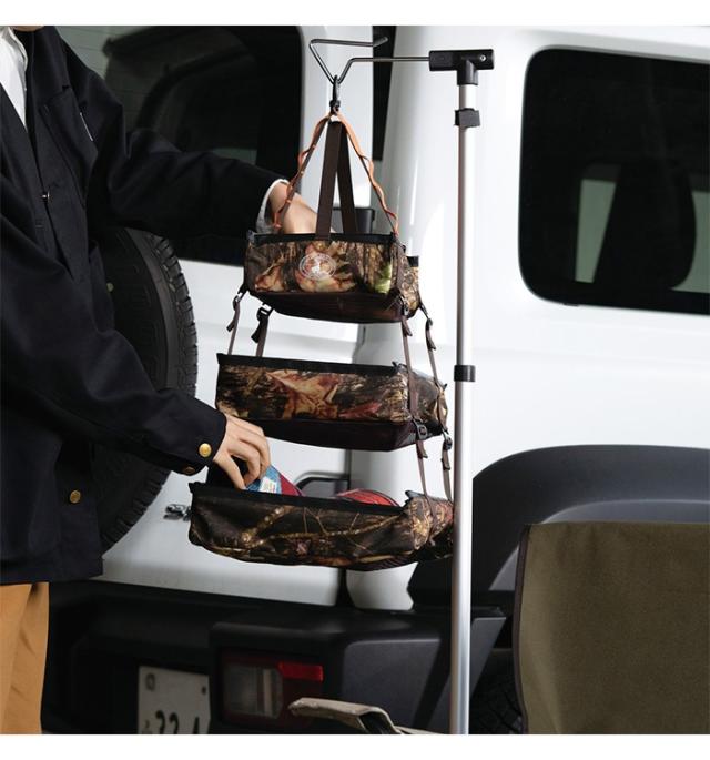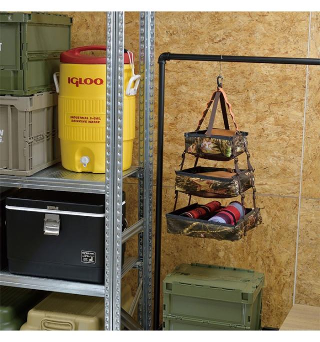| スペースを有効活用しながら分類して整理。 アウトドアではドライネットとして活用。 吊り下げ場所のスペースに応じて下2段は取り外し可能。 |