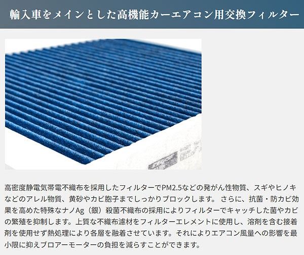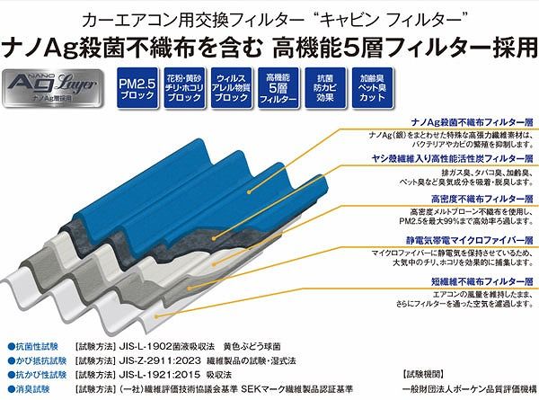 高密度静電気帯電不織布を採用したフィルターでPM2.5などの発がん性物質、スギやヒノキなどのアレルギー物質、黄砂やカビ胞子までしっかりブロックします。 さらに、抗菌・防カビ効果を高めた特殊なナノAg(銀)殺菌不織布の採用によりフィルターでキャッチした菌やカビの繁殖を抑制します。上質な不織布濾材をフィルターエレメントに使用し、溶剤を含む接着剤を使用せず熱処理により各層を融着させています。それによりエアコン風量への影響を最小限に抑えブロアーモーターの負担を減らすことができます。