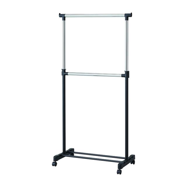 | パイプが上下2段あるので、大容量の収納が可能です。 キャスター付きなので簡単に移動ができます。 スペース、用途に合わせて上段パイプの高さを自由に調節できます。 |