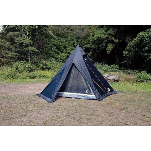 | 快適装備をプラスしたティピー型ワンポールテント。 前面には大型キャノピー、後面に出入口兼用の荷物室装備。 大人4人で使えるヘキサゴン(6角形)、インナーテントを長方形にすることで、前後に出入口兼用の荷物室を確保。 丈夫なスチール製ポールを2本使用。 天井2箇所に開閉可能なベンチレーションを装備。 キャリーバッグ付。 |