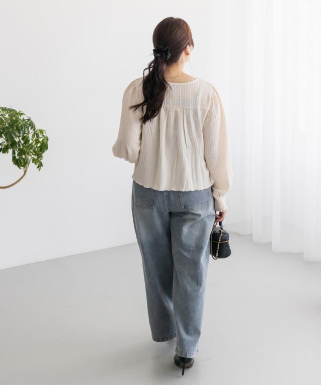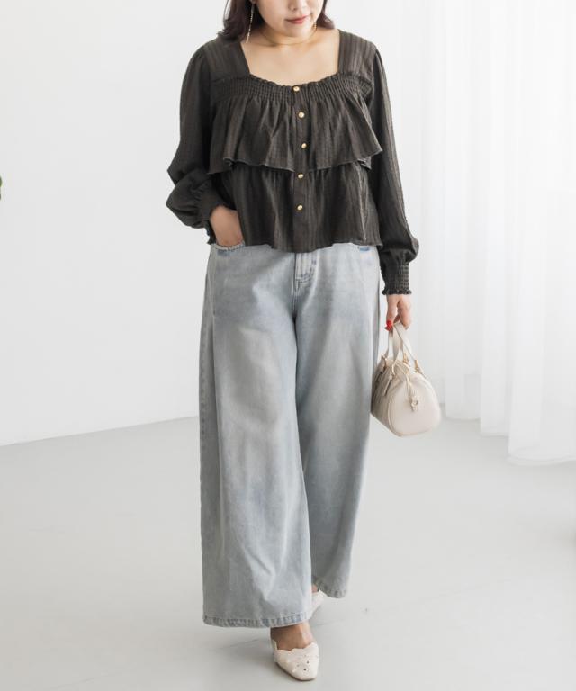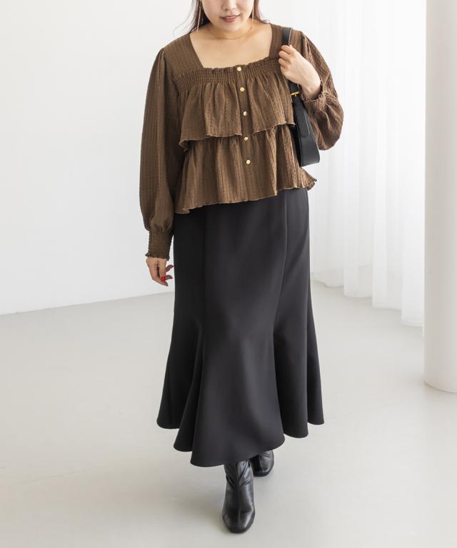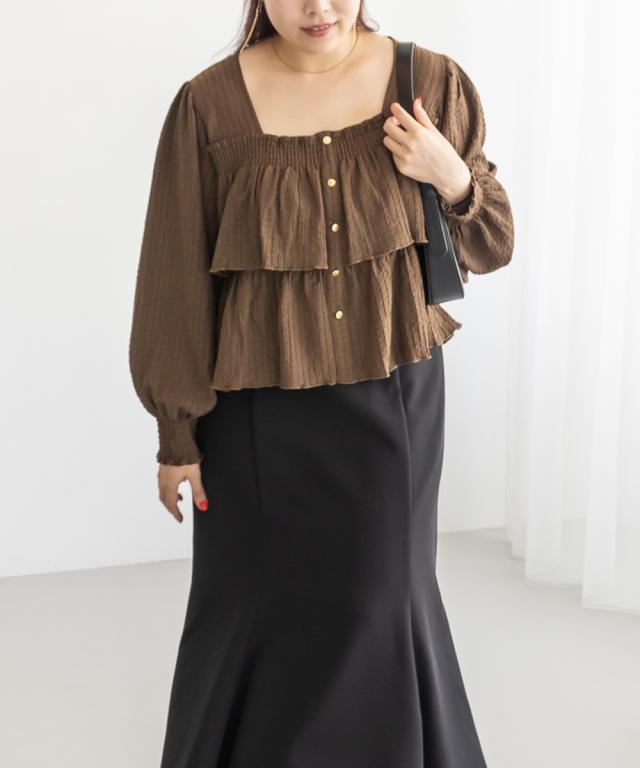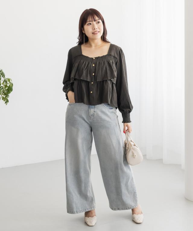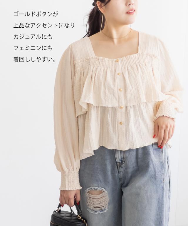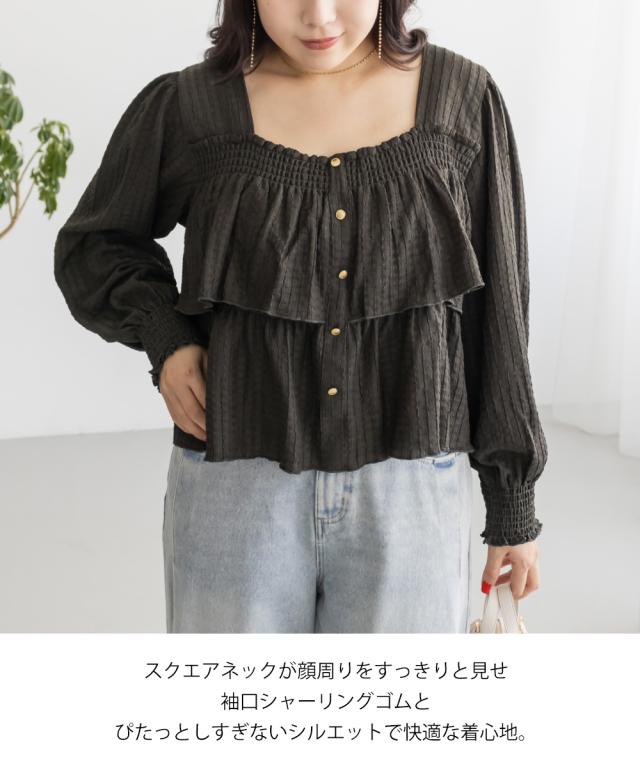 | 3Lサイズを着用して程よくゆとりを持って着られました!ピタッとせずに着られて、軽くてらくちん◎デコルテを綺麗に見せるスクエアネックと、メリハリのあるボタンデザインですっきり着やせした印象になれました♪生地自体も可愛いし、長袖なのでロングシーズン活躍します!デニムやスカート、どちらにも合わせやすくて、シンプルすぎず大人かわいく着こなせます! |