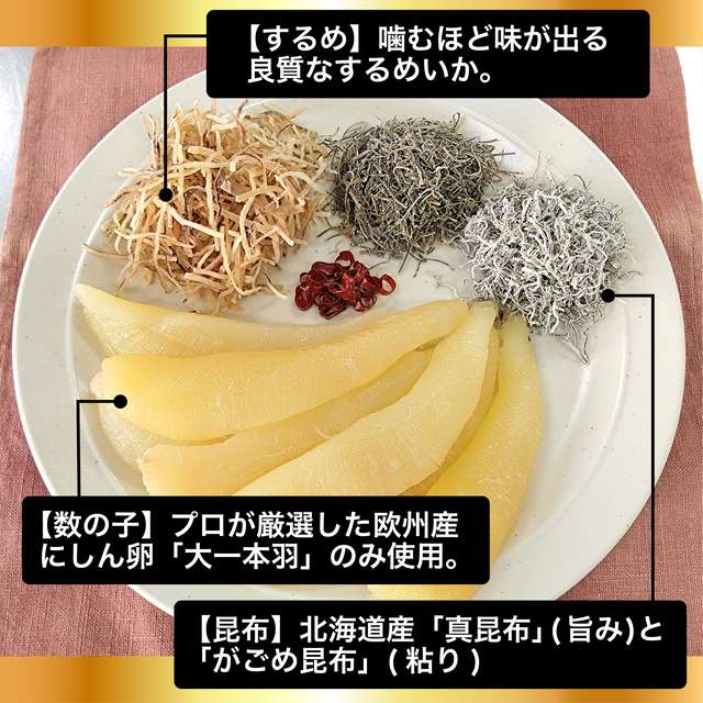 数の子(オランダ、ドイツ、その他)、複合調味液(しょうゆ、砂糖、みりん、その他)、するめ、こんぶ、食塩、唐辛子/甘味料(ソルビトール)、調味料(アミノ酸等)、酒精、pH調整剤、保存料(ソルビン酸K)、増粘多糖類、着色料(黄4、黄5、赤102、赤106)、(一部に小麦・いか・さば・大豆を含む)