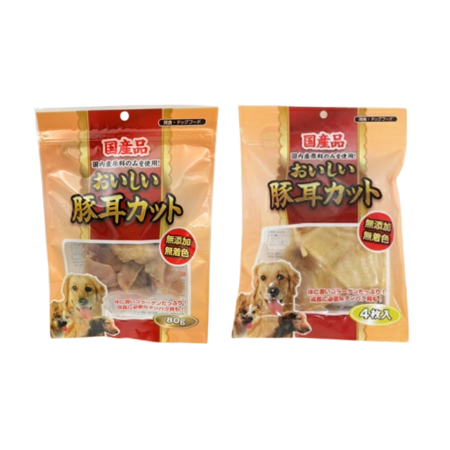 噛むほどに旨味が広がる!国産豚耳の贅沢おやつ。 愛犬が夢中になる「国産 おいしい豚耳」から、人気の2種類をセットにしたお試しパックが登場です。 どちらも安全・安心な国産豚耳を100%使用し、無添加・無着色で仕上げました。コラーゲンが豊富なので、愛犬の皮膚や関節の健康維持にも役立ちます。 「カットタイプ」は、小型犬やシニア犬でも食べやすい一口サイズ。一方、「カット4枚入り」は、じっくり乾燥させたハードな食感が特徴で、噛むことが大好きな愛犬にぴったりです。 噛み応えのあるハードな食感は、ストレス解消や歯磨き効果も期待できます。ぜひこのお試しセットで、愛犬の好みに合ったおやつを見つけてあげてください。