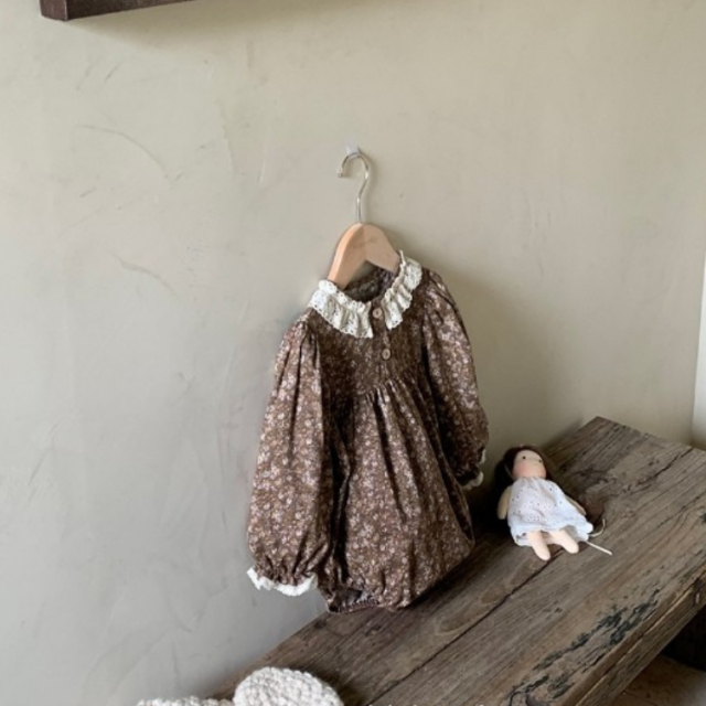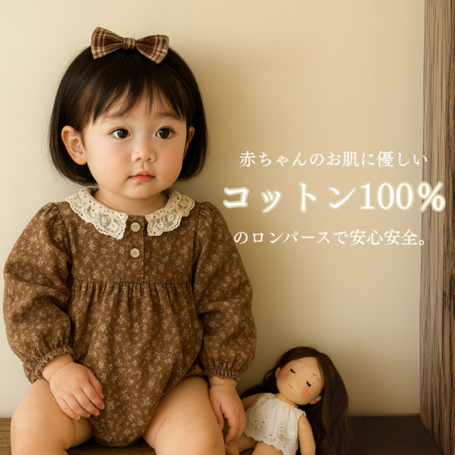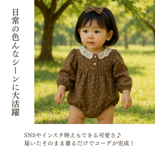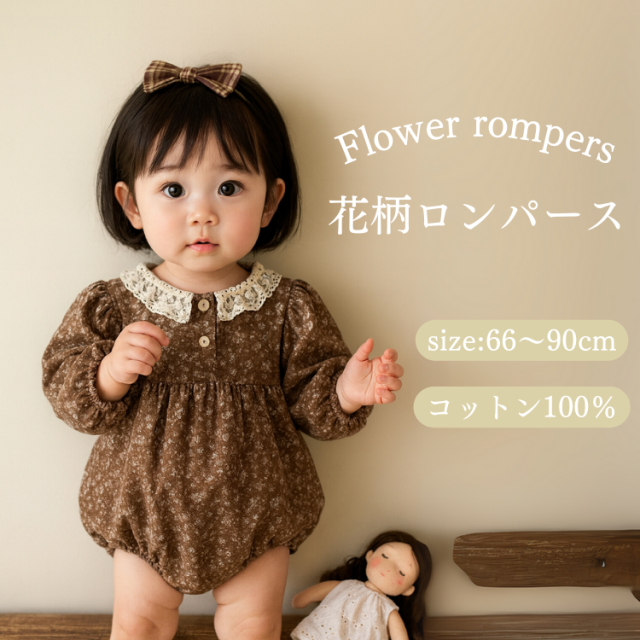 赤ちゃんのかわいらしさを引き立てる、ナチュラルで上品な花柄ロンパース。