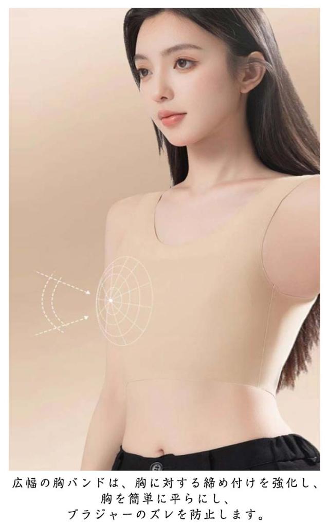 | シームレスデザインで目立たない、ノンホック設計で洋服に響かない、清潔な見た目を実現。 広幅の胸バンドは、胸に対する締め付けを強化し、胸を簡単に平らにし、ブラジャーのズレを防止します。 程よい締め付け感でバストを平らにすることができてスッキリに見えます。 シンプルなスタイルの丸ネックの仕様で着脱しやすく、お急いでいる時にも便利。 サイドが広くなっており、横乳を隠して細く見せてくれ、美しいシルエットをキープ。 軽くて柔らかい生地を採用し、一日中サラサラとした着用することができます。 バストを小さく見せたい方、スポーツや運動時揺れ出来るだけ押さえたい方、コスプレや男装される方におすすめします。 | |