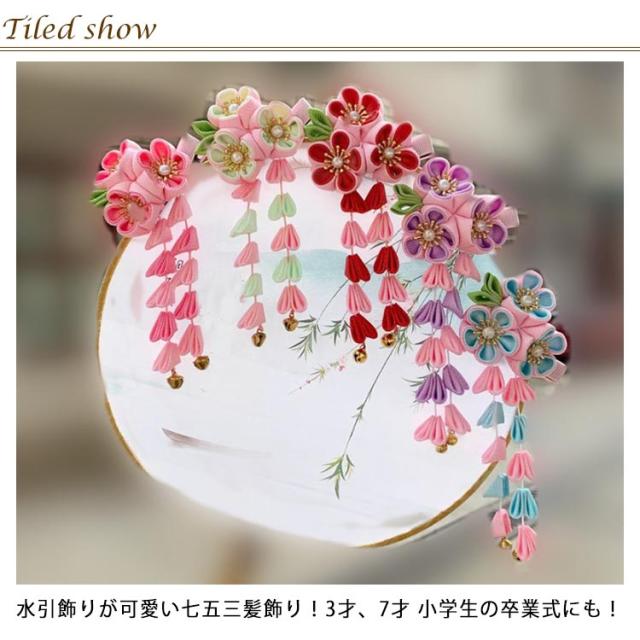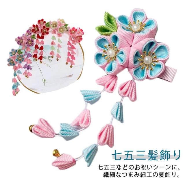 | 七五三髪飾り 七五三などのお祝いシーンに、繊細なつまみ細工の髪飾り。 水引飾りが可愛い七五三髪飾り!3才、7才 小学生の卒業式にも! 1つあればお顔周りがパッと華やぐので、特別な日の装いのワンポイントとして最適です。 | |