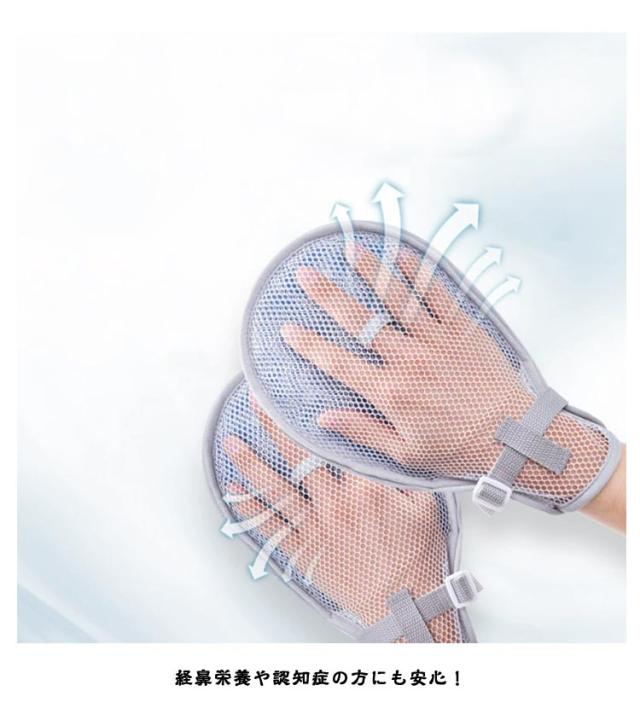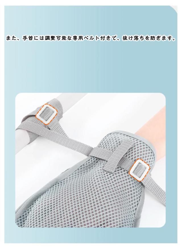 | かきむしり防止手袋 2枚セット 介護が必要な方が、体を引っかいてしまう、点滴などを抜いてしまうなどといった危険行為を防止するミトンです。 寝るときの無意識のかきむしりを防止し、ファスナー付きで指先だけをサッと出せる設計。体温確認や保湿ケア、ちょっとした作業もスムーズに。 手の動きを抑えるアクリル板が入っていて、物を握ることができない構造になっています。 通気性の良いメッシュ素材を使用しているため、長時間の使用でも快適にご利用いただけます。 汗をかいても、汚れても洗濯機で丸洗いOK。 経鼻栄養や認知症の方にも安心! | |
