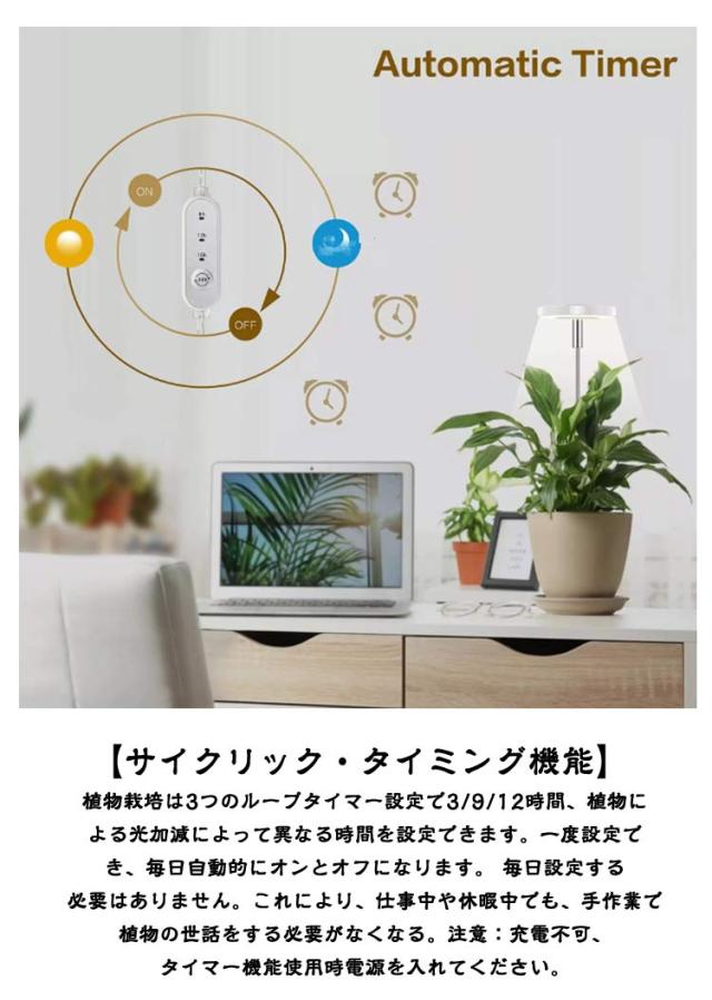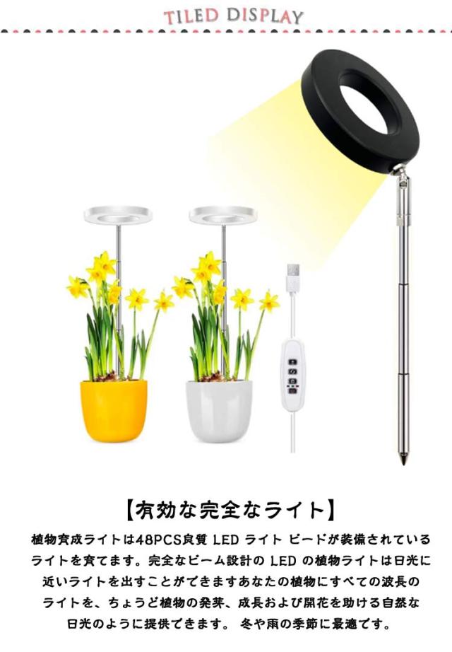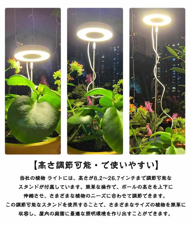 | 【有効な完全なライト】植物育成ライトは48PCS良質 LED ライト ビードが装備されているライトを育てます。完全なビーム設計の LED の植物ライトは日光に近いライトを出すことができますあなたの植物にすべての波長のライトを、ちょうど植物の発芽、成長および開花を助ける自然な日光のように提供できます。 冬や雨の季節に最適です。 【調光可能・9段階調光】当社の植物育成ライト、調光可能な 9 段階の明るさレベルがあります、光の強さをカスタマイズできます、それは異なったタイプの植物の異なった軽い必要性に合わせることが。低光量を好む植物から日光を愛する植物まで、このランプの下で最適な光環境を見つけることができます。理想的な栽培条件を実現します! 【サイクリック・タイミング機能】植物栽培は3つのループタイマー設定で3/9/12時間、植物による光加減によって異なる時間を設定できます。一度設定でき、毎日自動的にオンとオフになります。 毎日設定する必要はありません。これにより、仕事中や休暇中でも、手作業で植物の世話をする必要がなくなる。注意:充電不可、タイマー機能使用時電源を入れてください。 【2つの設置方法・ベース設置/挿入設置】2つの設置方法があります:1.取り外し可能な独立したベース設計、安定性を確保するために植木鉢をベースに置きます。2.調節可能なロッドを鉢植えに挿入し、希望の高さを調整するだけです。いつでもどこでも植物に十分な光を提供し、光の保護下で植物が健全に成長できるようにします。 【高さ調節可能・で使いやすい】当社の植物 ライトには、高さが8.2〜26.7インチまで調節可能なスタンドが付属しています。簡単な操作で、ポールの高さを上下に伸縮させ、さまざまな植物のニーズに合わせて調節できます。この調節可能なスタンドを使用することで、さまざまなサイズの植物を簡単に収容し、屋内の庭園に最適な照明環境を作り出すことができます。 【USB電源・幅広い用途】育成ライトはUSB電源方式を採用しており、いつでもどこでも簡単に充電が可能です。また、USB電源方式はエネルギー消費を削減し、環境に優しく。植物工場、地下室、花栽培、屋内庭園、水溶性育種、パイプライン栽培、野菜栽培、ガーデニング、家族栽培/種まき、温室多肉植物などに最適です。 | |