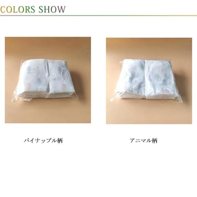 | 大人気子供用食事エプロン。50枚入り 使い捨てのお食事エプロンなので衛生的! ペーパービブよりも吸水力に優れた不織布のエプロンです。 首から落ちにくくズレにくい固定テープ付き。 破れにくい3層構造、しっかりとした不織布で作られており、離乳食の時期や食べこぼしの心配なし。 動物柄やパイナップル柄など、かわいらしいデザインが特徴。 お出かけや外食時にも便利な携帯用で、持ち運びが簡単。 裏には防水・漏れ防止の防水フィルムがついていますので、ミルク、お湯や水を飲む時も赤ちゃんの服を濡らす心配がありません。防水で通気性がよく、夏に着けても蒸し暑く感じません。 お気に入りの可愛いお洋服が汚れないように設計をさせていただきました。 男の子にも女の子にもぴったりなアイテムで、出産祝いにも最適です。 | |
